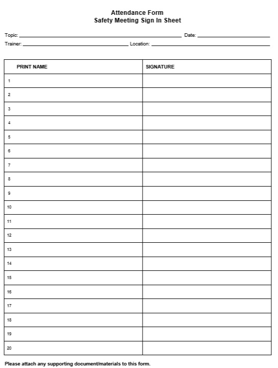 Attendance Form. Safety Meeting Sign In Sheet. Topic: Date: Trainer: Location: PRINT NAME. SIGNATURE. 1. 2. 3. 4. 5. 6. 7. 8. 9. 10. 11. 12. 13. 14. 15. 16. 17.